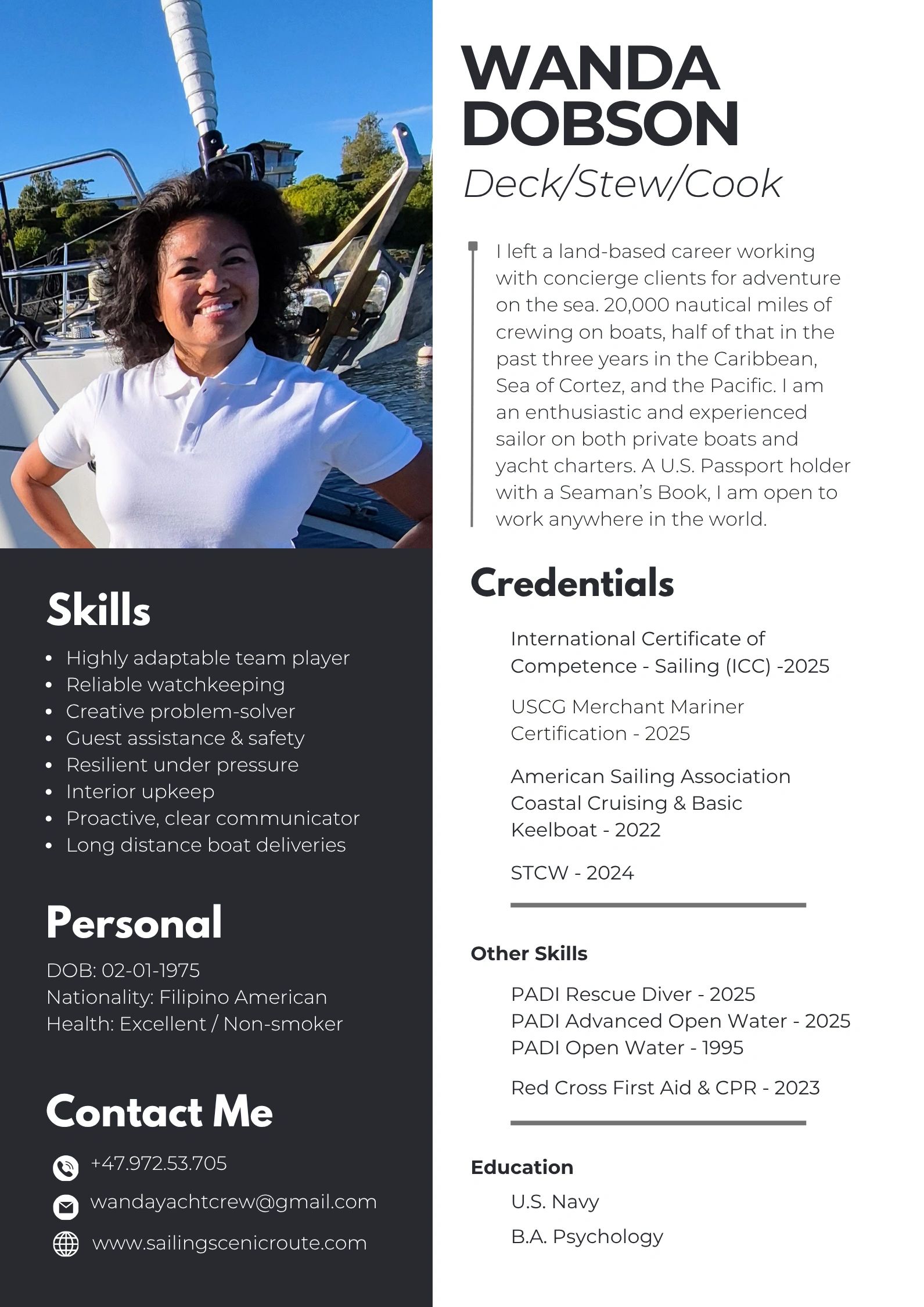 I left corporate insurance marketing and now focus on wellness copywriting and ghostwriting. My major goals in 2025 are obtaining more offshore experience and a Rescue Diver Scuba Certification. I look forward to new sailing adventures in French Polynesia this Spring; and Norway, Sweden, Denmark this Summer.