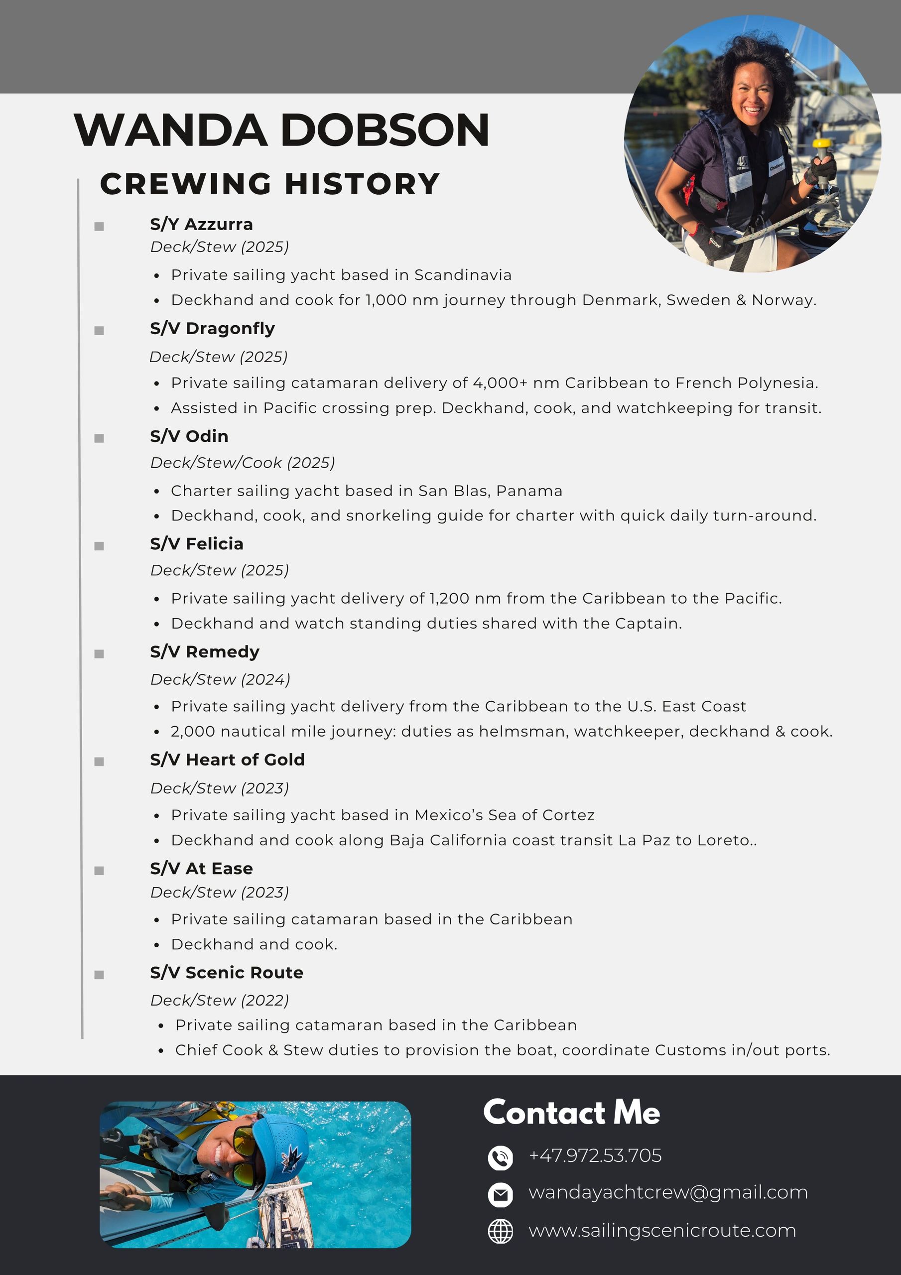 Check for my availability as crew on your next adventure.
